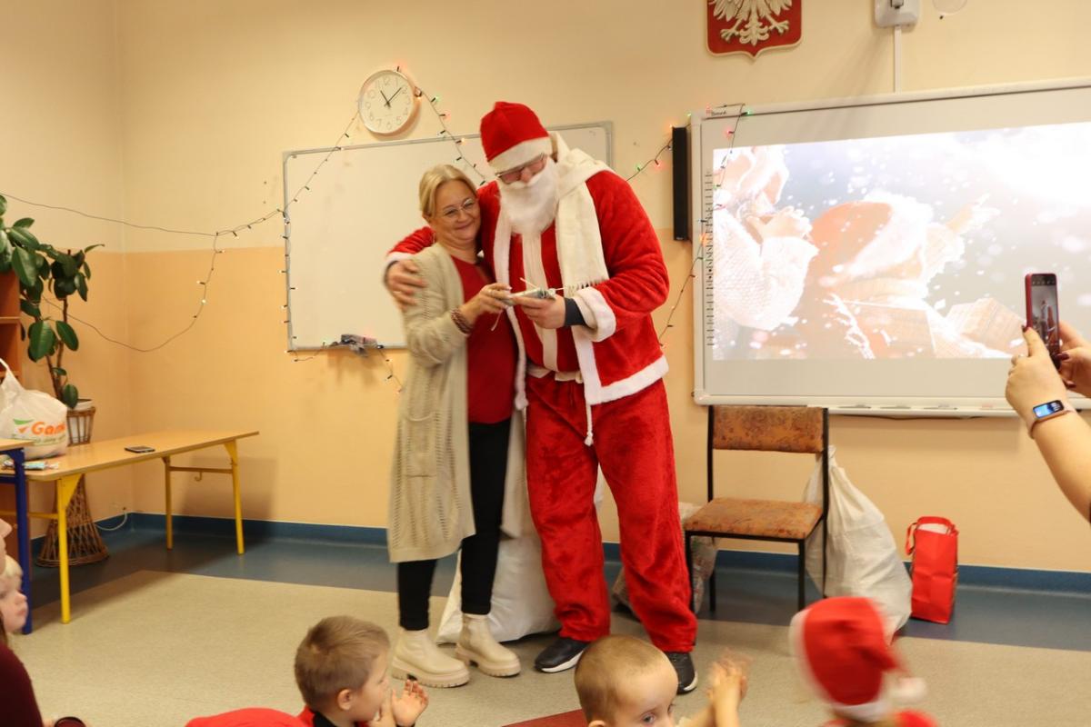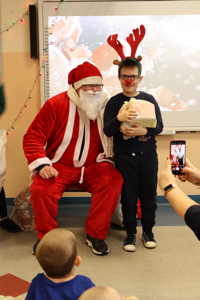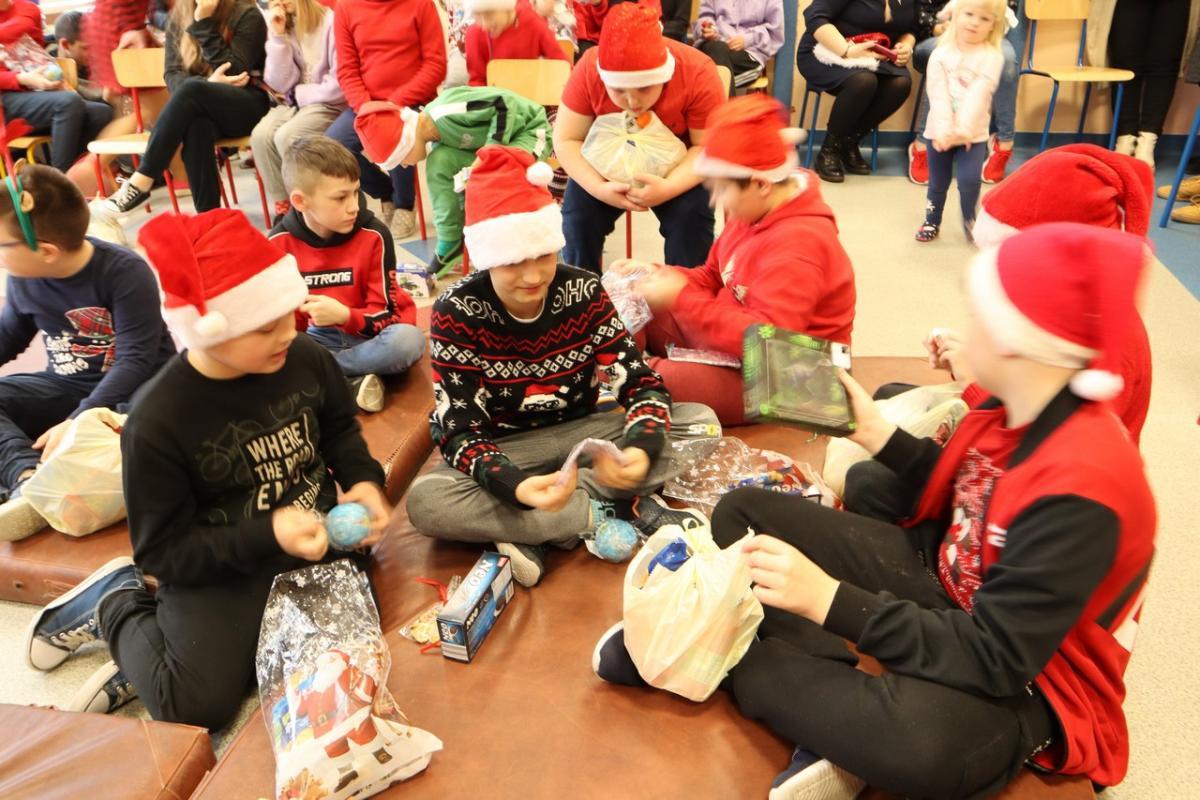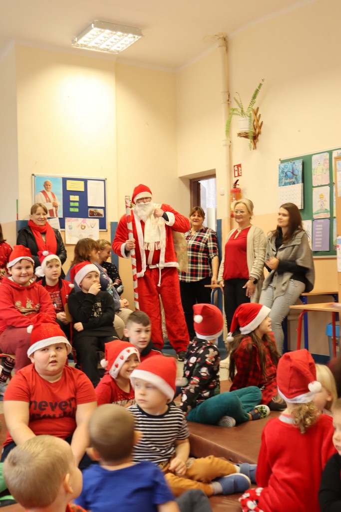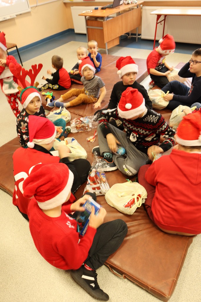 Mikołaj przybył w asyście dwóch elfów, które pomogły mu odczytywać imiona dzieci dzieci, bo u Mikołaja oczy już nie te. Na początku prezenty otrzymały maluszki, potem klasy młodsze i na końcu klasa ósma. A jakże nie obyło się bez wierszyków i piosenek dla Mikołaja. Mikołaj nie zapomniał też o nauczycielach – każdy z nich otrzymał drobny słodki upominek.