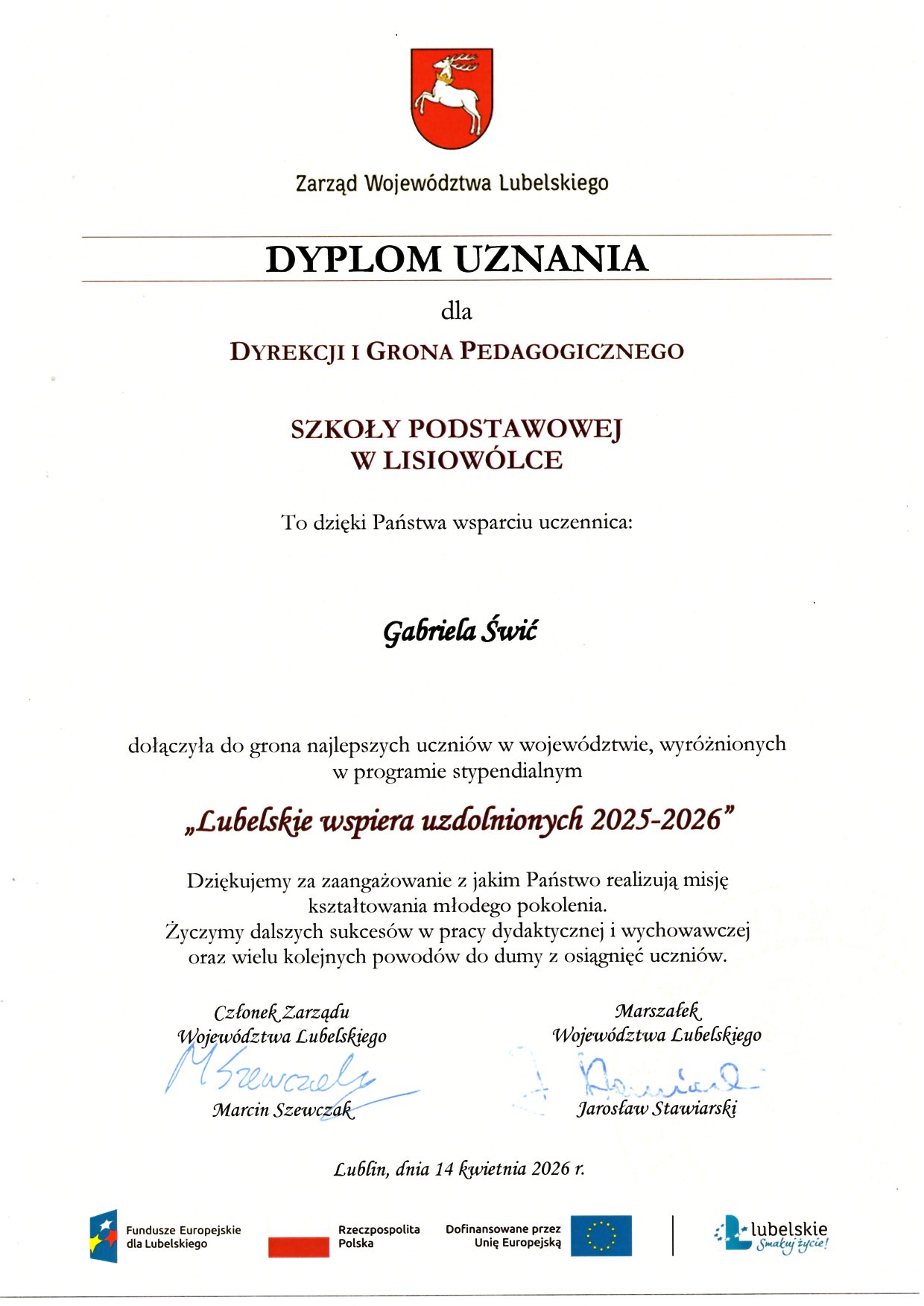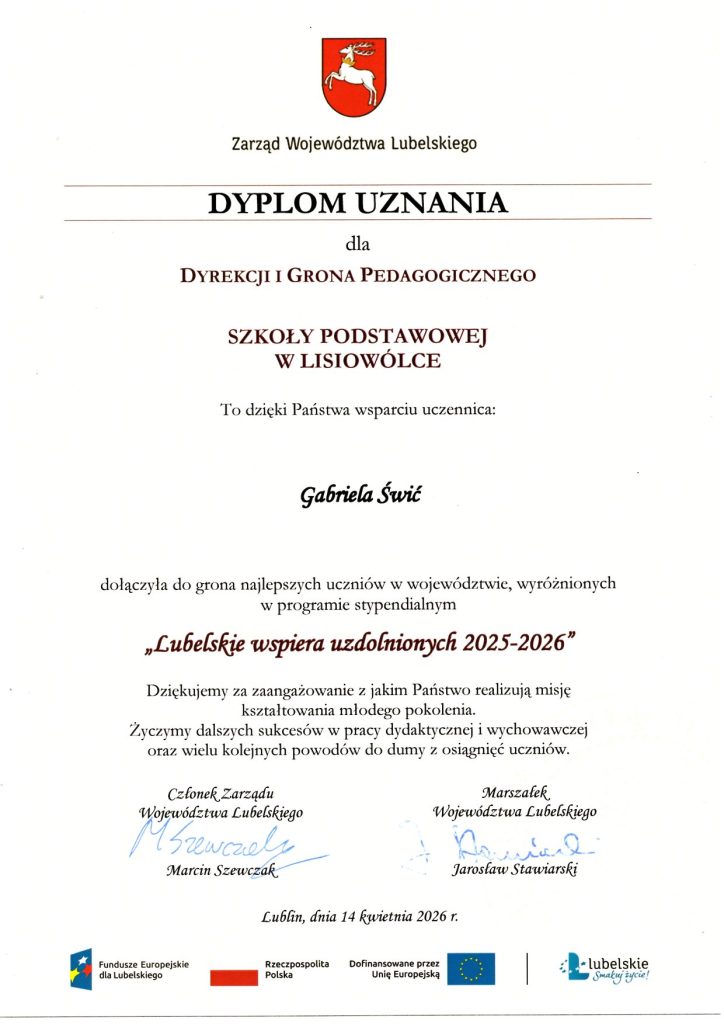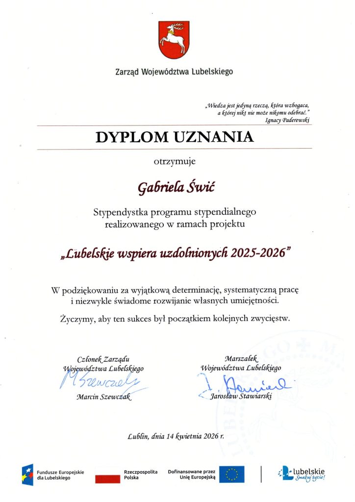 Z dumą i wielką radością informujemy, że nasza uczennica, Gabriela Świć otrzymała stypendium w ramach programu „Lubelskie wspiera uzdolnionych 2025–2026”.