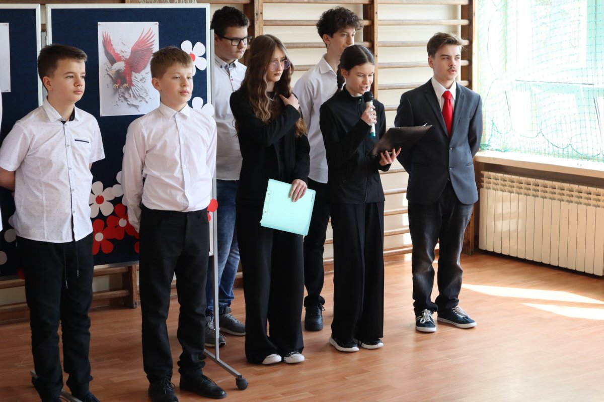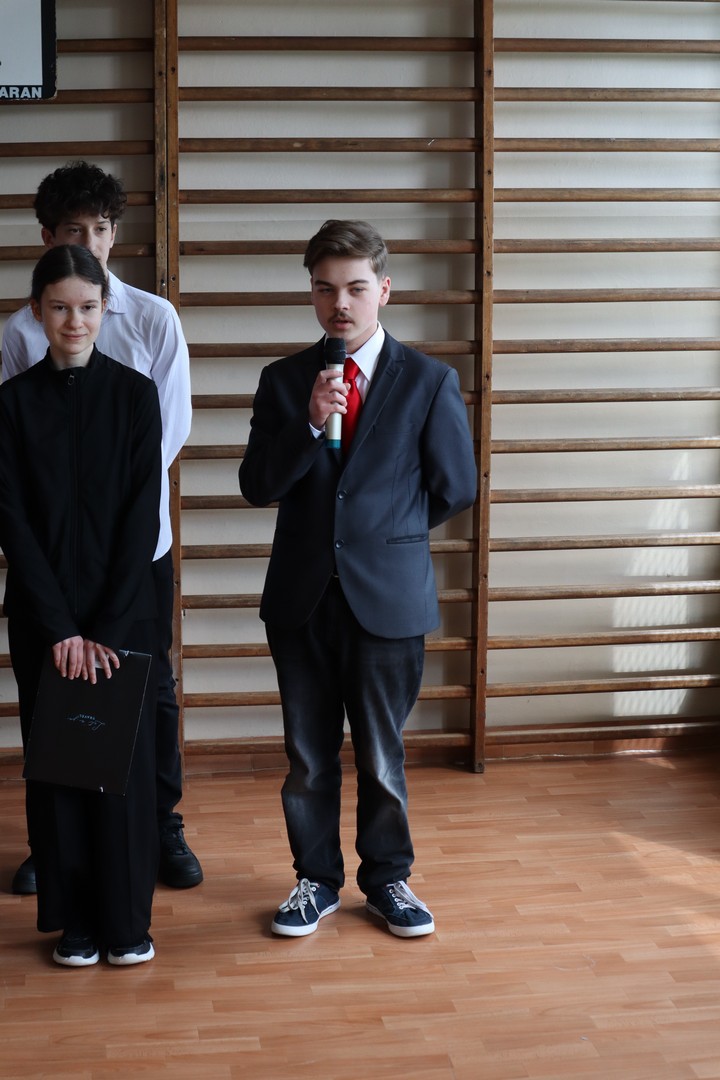 Uroczystość rozpoczęła się od wspólnego odśpiewania hymnu państwowego. Wszyscy zgromadzeni – uczniowie, nauczyciele oraz pracownicy szkoły – z należytą powagą i szacunkiem oddali hołd symbolom narodowym. Już od pierwszych chwil dało się odczuć atmosferę jedności i patriotyzmu.